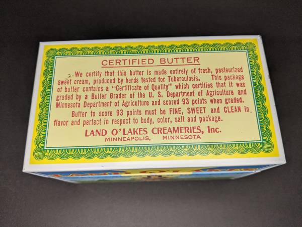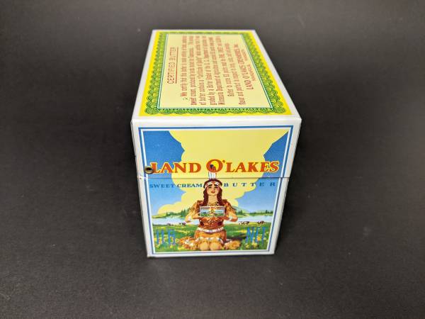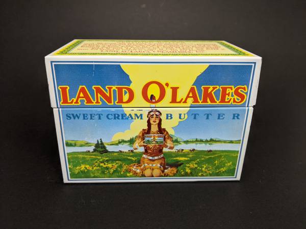 USA made Land o' Lakes Butter Recipe box. Tin is modeled to look like the old butter packaging prior to the current 2020 label. Includes unused recipe cards that each feature a label and the Land o' Lakes stamp.