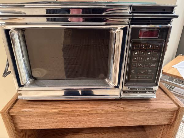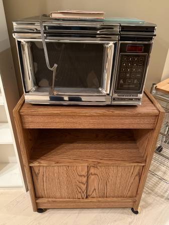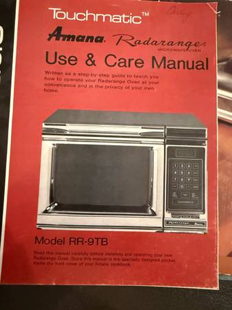 Vintage Amana Radarange Microwave (1981). Model # RRL-9TB. Great shape, display works perfect and cooks. Internal light is only item that doesn’t work. Cabinet base included.