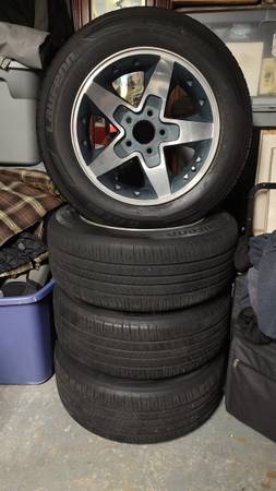 Includes center caps w/ lug covers. One center cap the lug cap mounting is missing (see pic). Good 225/60 tires. No rush to unload, just nothing to put them on at the moment. Just tossin them out there til I do. Sooo If by chance you got a semi decent cheap 2wd 1st or 2nd gen S10/Sonoma driver with a good frame you wanna sell let me know, I might be interested.
