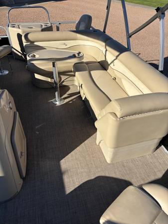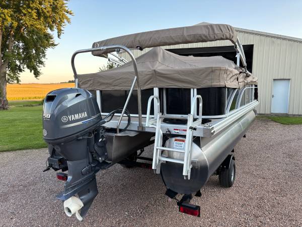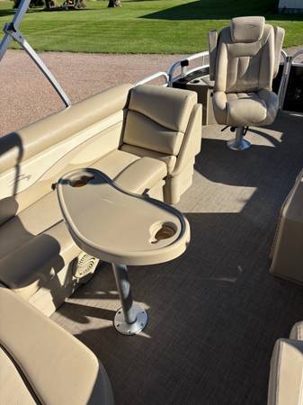 S 20 Bennington it is a 2015 with a 50 hpYamaha four stroke, low hours, also a 2015. The trailer is also a 2015. It has three reclining captain chairs and two smaller swivel chairs, a bench seat, and table. Two live wells front and back. when it wasn’t under the canopy, it was stored inside.