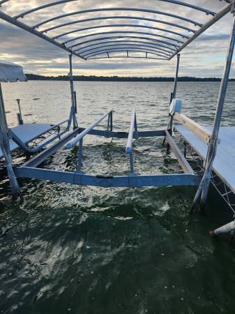 132 Wide x 34 Foot Canopy, 110v, New White canopy last year, Currently set up for Pontoon but also have boat setup also like in pictures. Has remote and currently still in the water. Will consider trade for 5000/6000lb Shorestation hydraulic 24v Solar, prefer set up for pontoon.