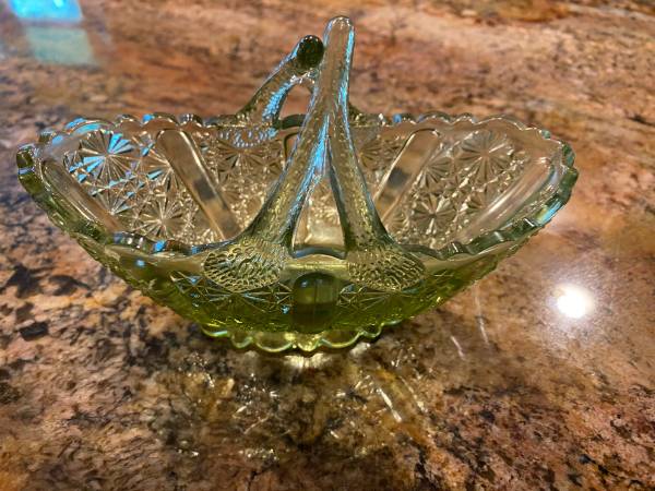 For sale: Fenton Art Glass basket, specifically an oval basket in Colonial Green with the Daisy & Button pattern