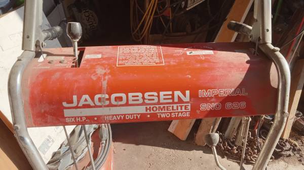 626 JACOBSEN HOMELITE SNOW BLOWER. 6 HP, 26 INCHES WIDE, SELF-PROPELLED FORWARD AND REVERSE, NEW ELECTRIC START NEW PULLSTART STARTS VERY EASY RUNS EXCELLENT DON'T LEAK ANYTHIG DON'T USE OIL FRESH OIL CHANGE OLDER MACHINE HEAVEY DUTY BUILT SOLID BUILT TO LAST SOLID LUG TIRES EXCELLENT CONDITION READY TO WORK. NO TEXTING NO E-MAILS CALL ONLY 1 507 three two seven one six nine four.