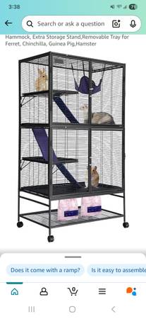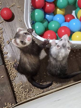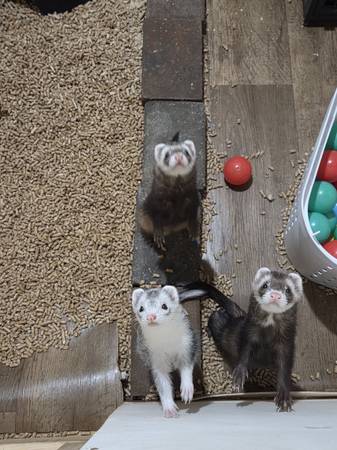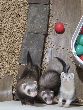 I am looking to rehome my three ferrets. All are about a year and a half old. Two are female and one is male. All fixed. They come with their cage that is currently disassembled because I keep them in a pen. I attached an image of what the cage looks like put together. It just snaps back into place.