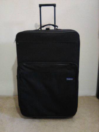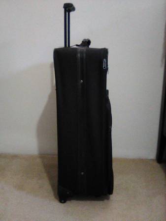 This is NOT carry-on size. Measures 28" tall, plus the wheels x 19" wide x approx 10" deep. 3 front zippered pockets also. 2 inside zippered pockets. Very good condition. $20 cash suitcase suit case...