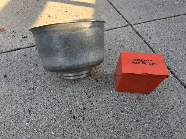 Old dairy farm milk strainer. Text: five zero seven-508-six seven one eight.