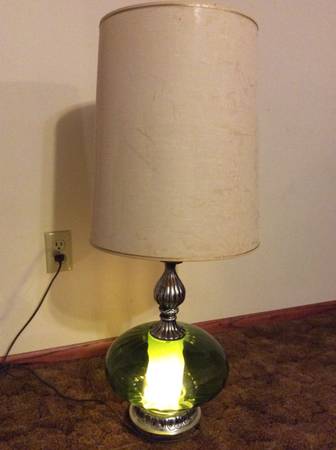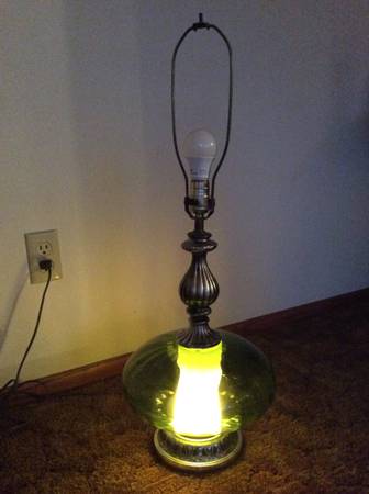 Rare, Emerald City Green hand blown glass and brass, 3-way table lamp with shade. The bottom portion contains the white diffuser still intact. Lamp is in excellent condition, is all original, and has new bulbs. The shade is in good to fair condition. Smoke free item. $110 cash