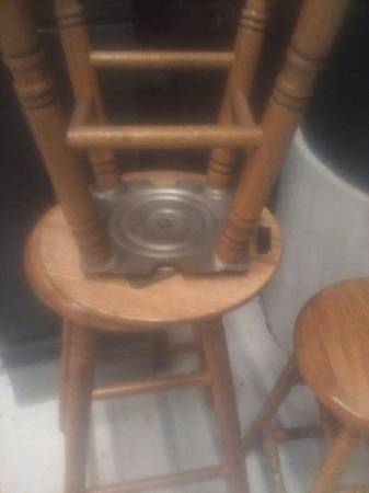 Set of 3 oak stools. Tallest swivels and is 30 inches high by 13 inches across the top. One of the other 2 small ones swivels and they are both 24 inches high and seat is 13 inches across the top.
