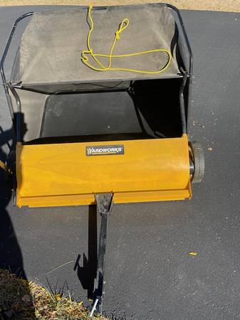 For sale, bought brand new a 38" pull behind lawn sweeper in excellent condition, only used 2 years. Has a side bar for adjusting the height of sweeper brushes to allow for grass height. Needs to sell, I only have one tree on lot. now can use hand rake. Has a slide-to-side draw bar for easy storage with less storage space needed. IN good working condition with nylon rope pull for easy to dump leaves.