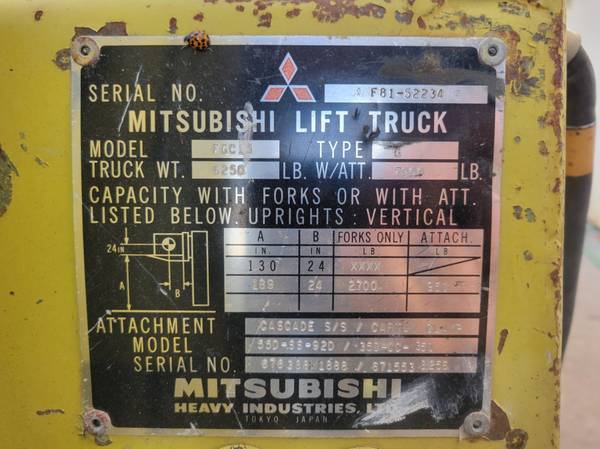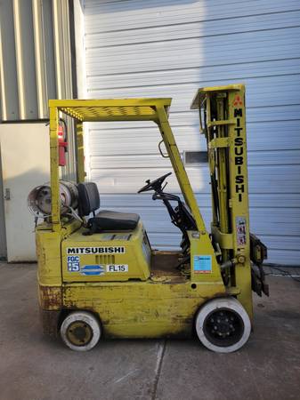 Mitsubishi FG15 propane forklift. Runs, drives, and shifts, with a 3,000 lb lift capacity. Comes with solid/cushion tires and standard 42″ forks.
