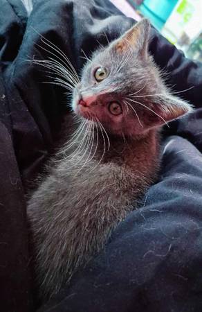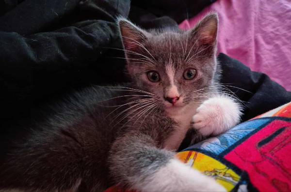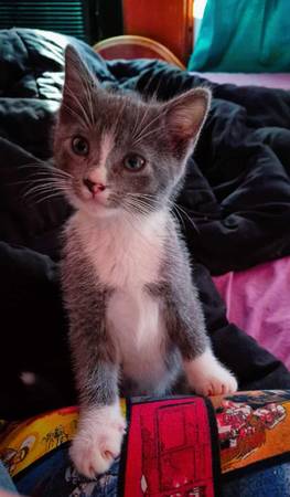 Female kitten available, friendly grey and white tuxedo, small rehoming fee