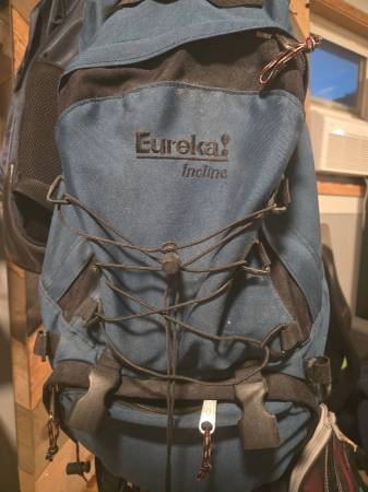 Eureka! Incline Medium Backpack. Frameless. Large Hip Belt. 2 compartments: approx. 11 x 10 x 4 and 6 x 10 x 4. Exterior good condition; interior very good conditions. No tears or holes.