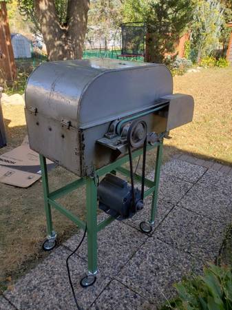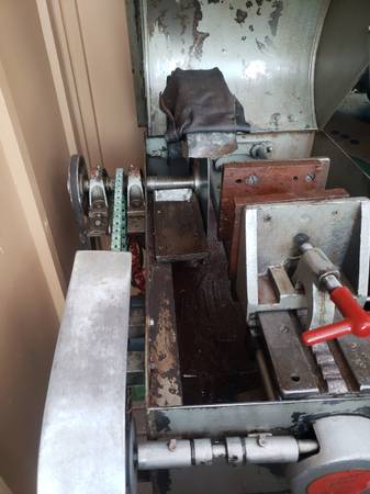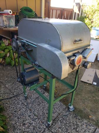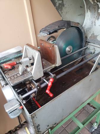 Clean Highland Park M-2 slab saw with clean cutting 14 inch diamond blade. Includes 5 Gal. HP Coolcut mineral oil. Angle-iron table on caster wheels. Saw lifts off caster wheel table. Works Great...